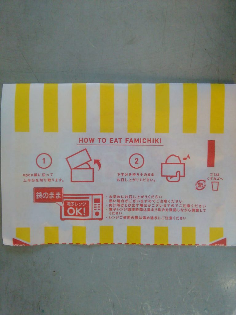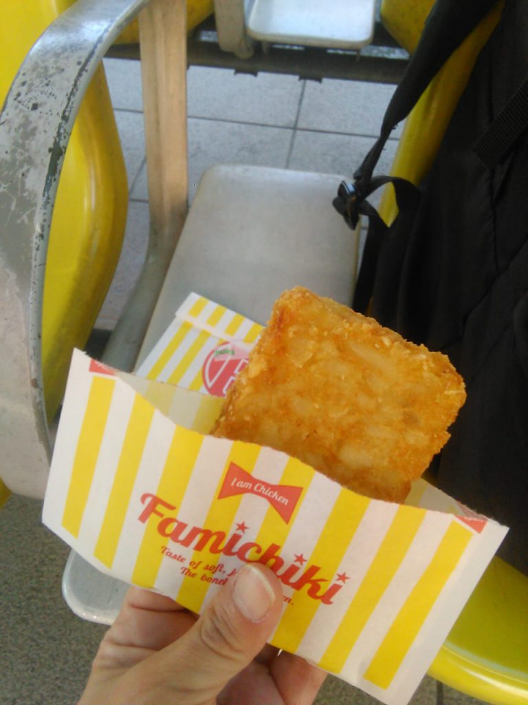 Lo interesante es que en la línea de productos famichiki, que principalmente están orientados al pollo, hay una papa rosti (que es como esa papa rallada y rearmada) a menos 100 yenes. Estos productos se venden calentitos y en un sobrecito para no ensuciarte los dedos, aunque en Japón toda venta de comida suele acompañarse de una servilletita húmeda.