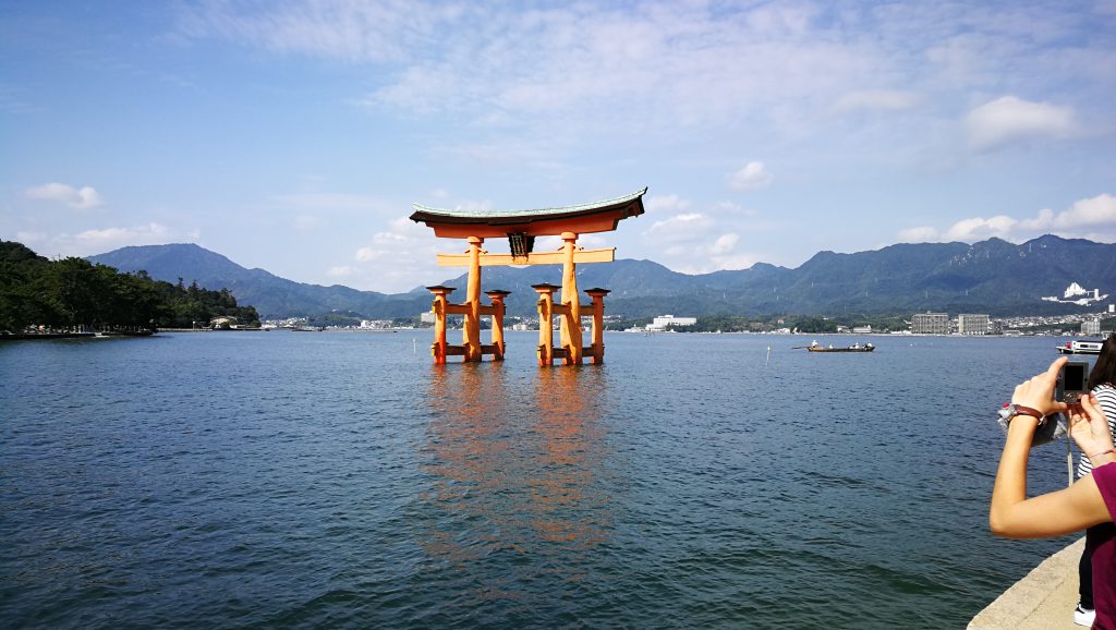 Al día siguiente despertate y salí para la estación, vamos a ir a Miyajima. Entonces nos tenemos que tomar el tren hasta la estación Miyajimaguchi. Seguramente la mayoría de personas en el tren y especialmente los turistas, se bajarán ahí. Seguí a la manada que van a hacer unas cuadras y terminar en el puerto. De ahí con el JR te tomas el ferry y cruzas a la isla Itsukushima. Tene la cámara/celu en la mano xq ya desde el barco vas a ver el Tori flotante de Itsukushima.