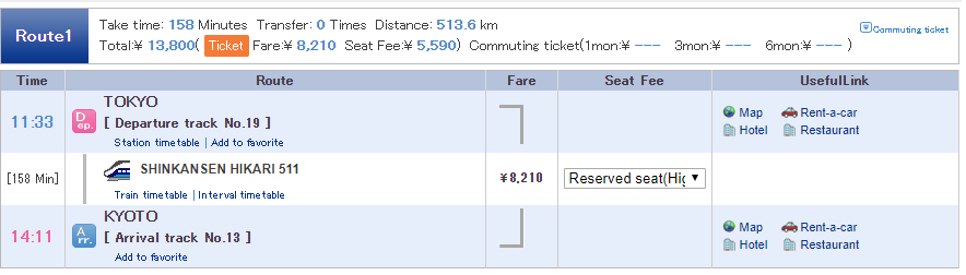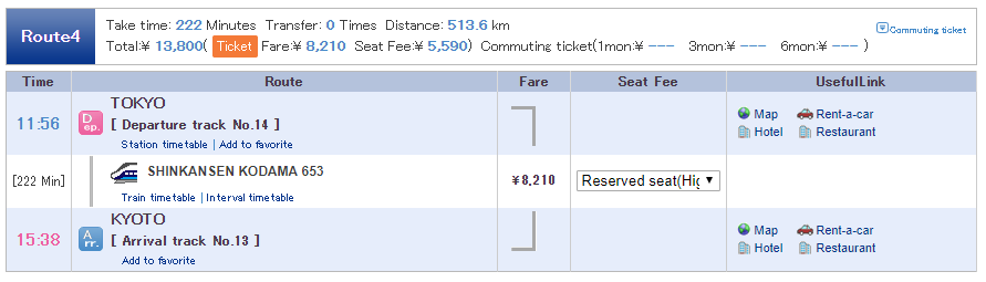 Si buscas como llegar por ejemplo, de Tokyo a Kyoto te va pasar en Shinkansen o en trenes comunes pero no te va a diferenciar que tipo de tren bala. Esto es importante por varias razones, si compraste el jr básico solo vas a tener incluido el Hikari, Kodama y Sakura , ademas todos estos trenes tardan diferentes tiempos en llegar a los mismos destinos.
