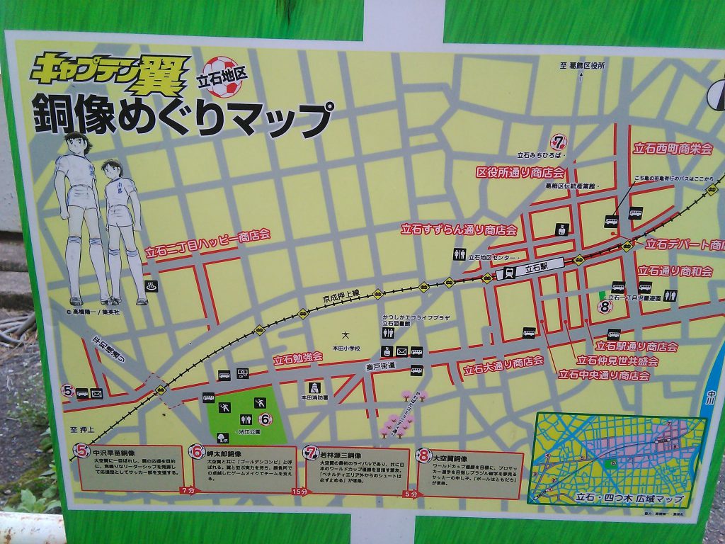 En Katsushika Ku pasa, entre muchos otros trenes, la Keisei line. En la estación Yotsugi de dicha línea comienza la recorrida de las estatuas de bronce de Capitan Tsubasa o “Supercampeones” y es una aventura digna de disfrutar.